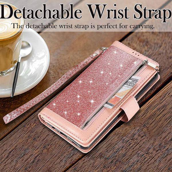 ▶[LARGE CAPABILITY+WRIST STRIP]:Inside features 9 card slots,1 zipper coin pocket, 2 side pockets conveniently store your ID, license,photo,cash and credit cards.Detachable LEATHER HAND STRAP to allow for easy fastening and access to your Phone without hassle.