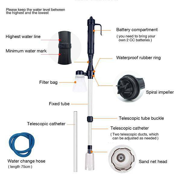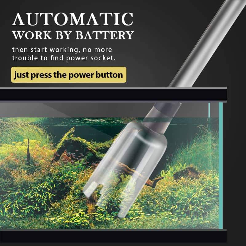Unlike traditional tool which requires manual pressing to work, this fish tank vacuum cleaner uses 2 x batteries (2 C/LR14), just press the power button then start working, no more trouble to find a power socket.